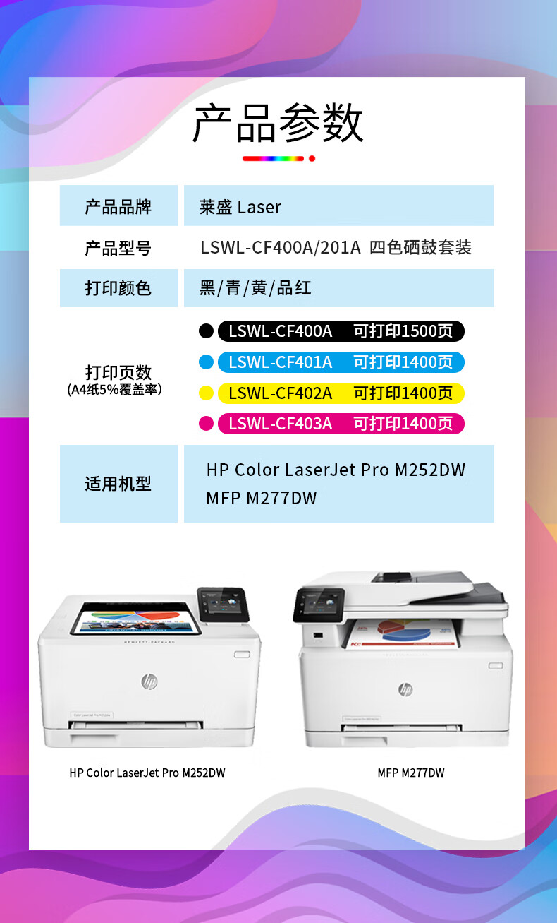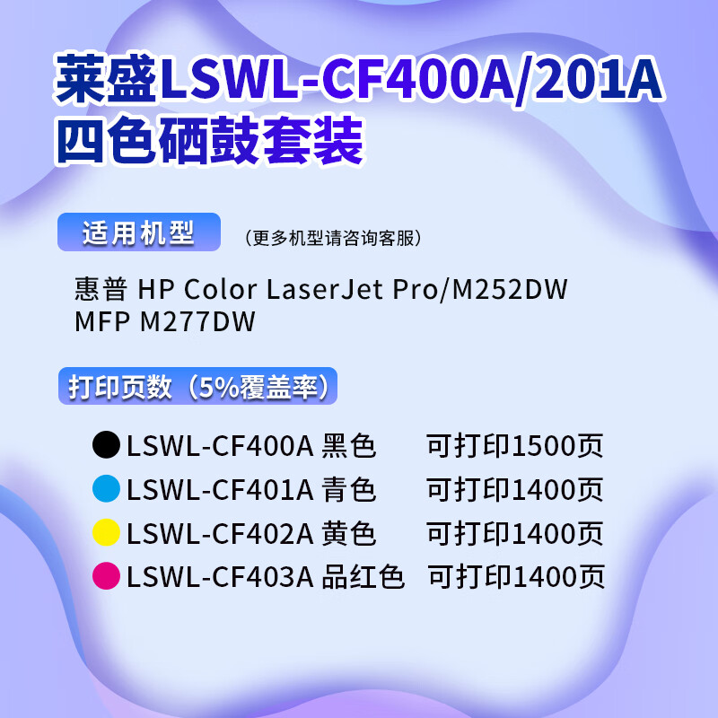商品名称:莱盛CF400A/201A四色硒鼓套装 适用于惠普HP m277dw M252 252N 252DN 252DW M277n